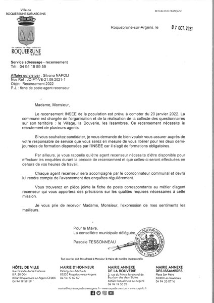 Si vous êtes intéressé(e), merci d’adresser votre candidature, après accord de votre hiérarchie, à Mme Silvana NAPOLI, coordinatrice recensement, AVANT LE MARDI 30 NOVEMBRE 2021 : snapoli@mairie-roquebrune-argens.fr
