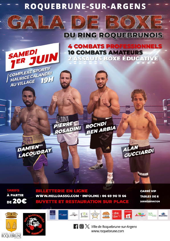 Grande soirée de boxe anglaise organisée par le Ring Roquebrunois, le samedi 1er juin à la salle Maurice Calandri au Village. Ouverture des portes à 18h.