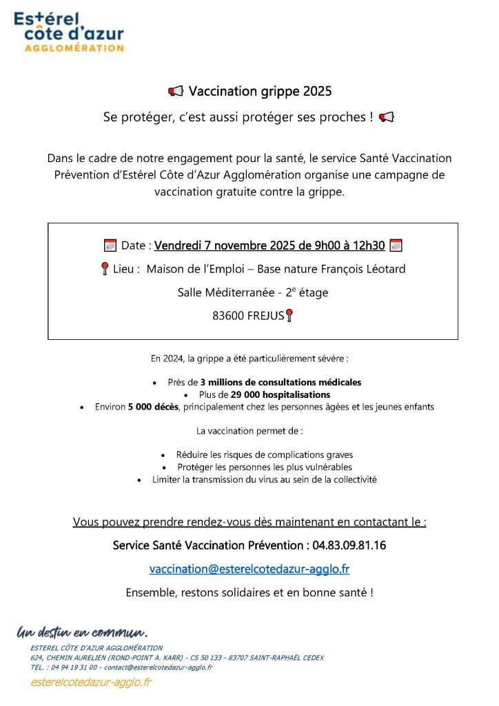 Le service Santé Vaccination Prévention d’Estérel Côte d’Azur Agglomération organise une campagne de vaccination gratuite contre la grippe. Vous trouverez ci-dessous la note d’information.